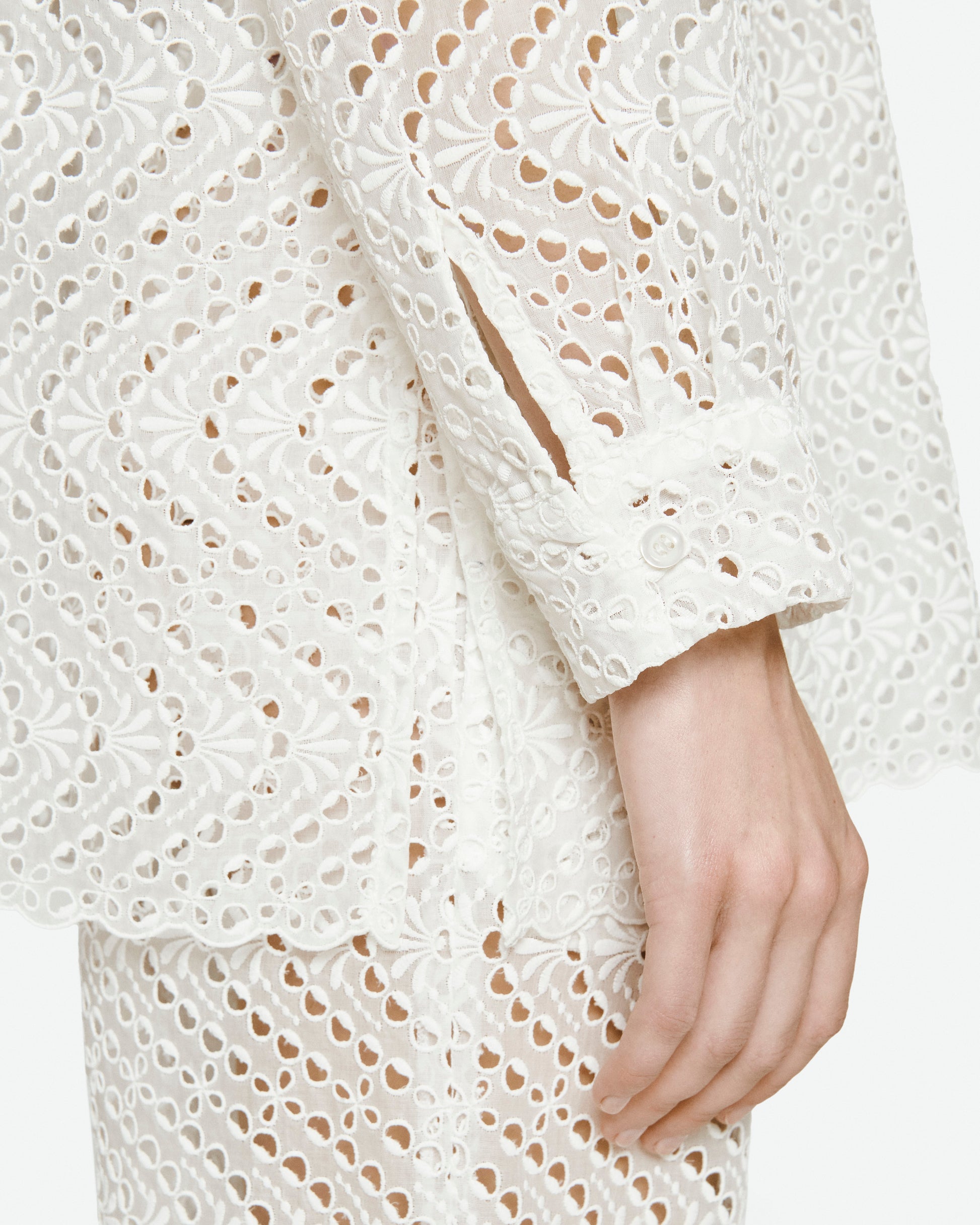 White English broderie pants. Thin elastic waistband for ease and comfort. Lightly flared, ankle-length silhouette. Essential summer piece with two interior pockets.