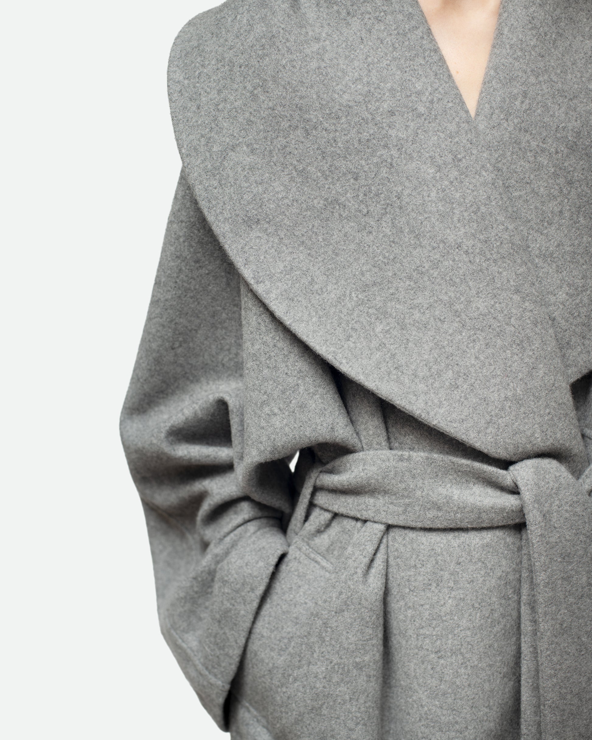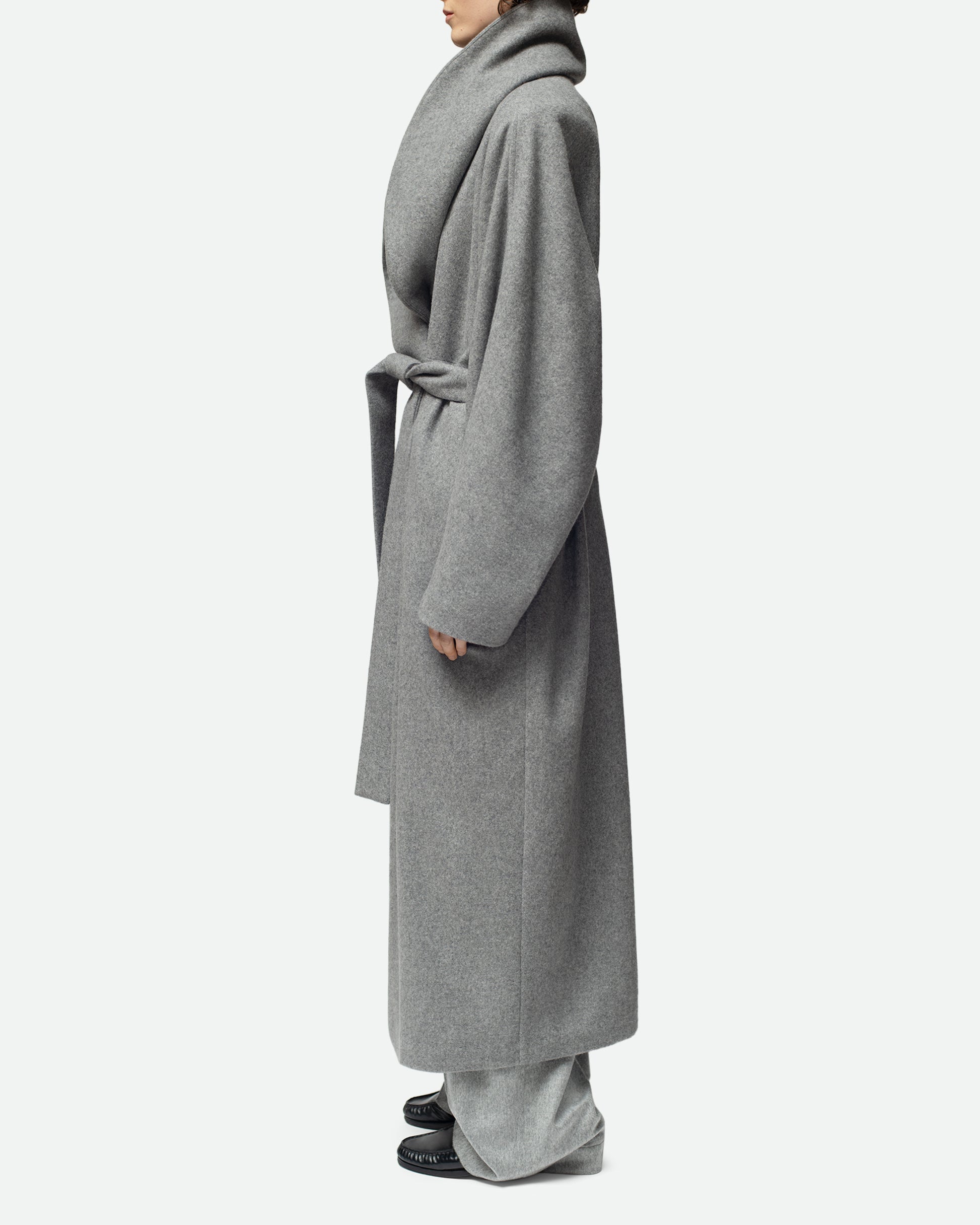 Long double breasted cashmere coat with adjustable belt in soft light grey cashmere. Versatile volume collar covering the neck or shoulder