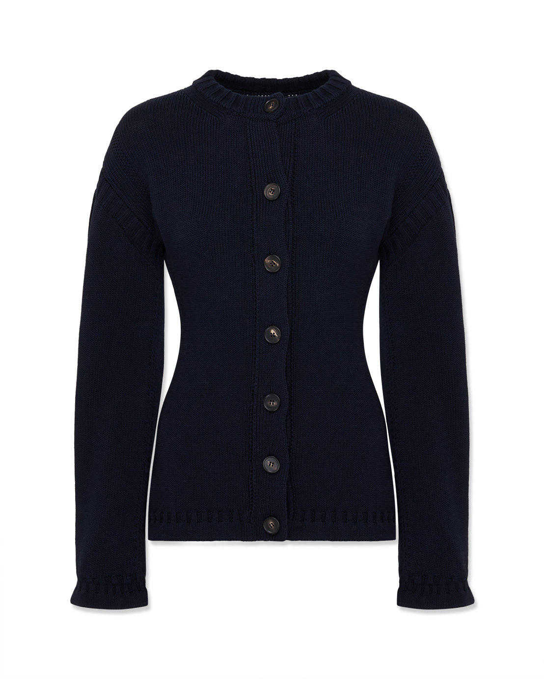 Round-neck cardigan crafted from 100% cotton in a deep navy blue. Designed with a clean, uniform body contrasted by textured knit detailing at the collar, cuffs, and hem. A balanced silhouette offering structure and ease, suitable for everyday layering.