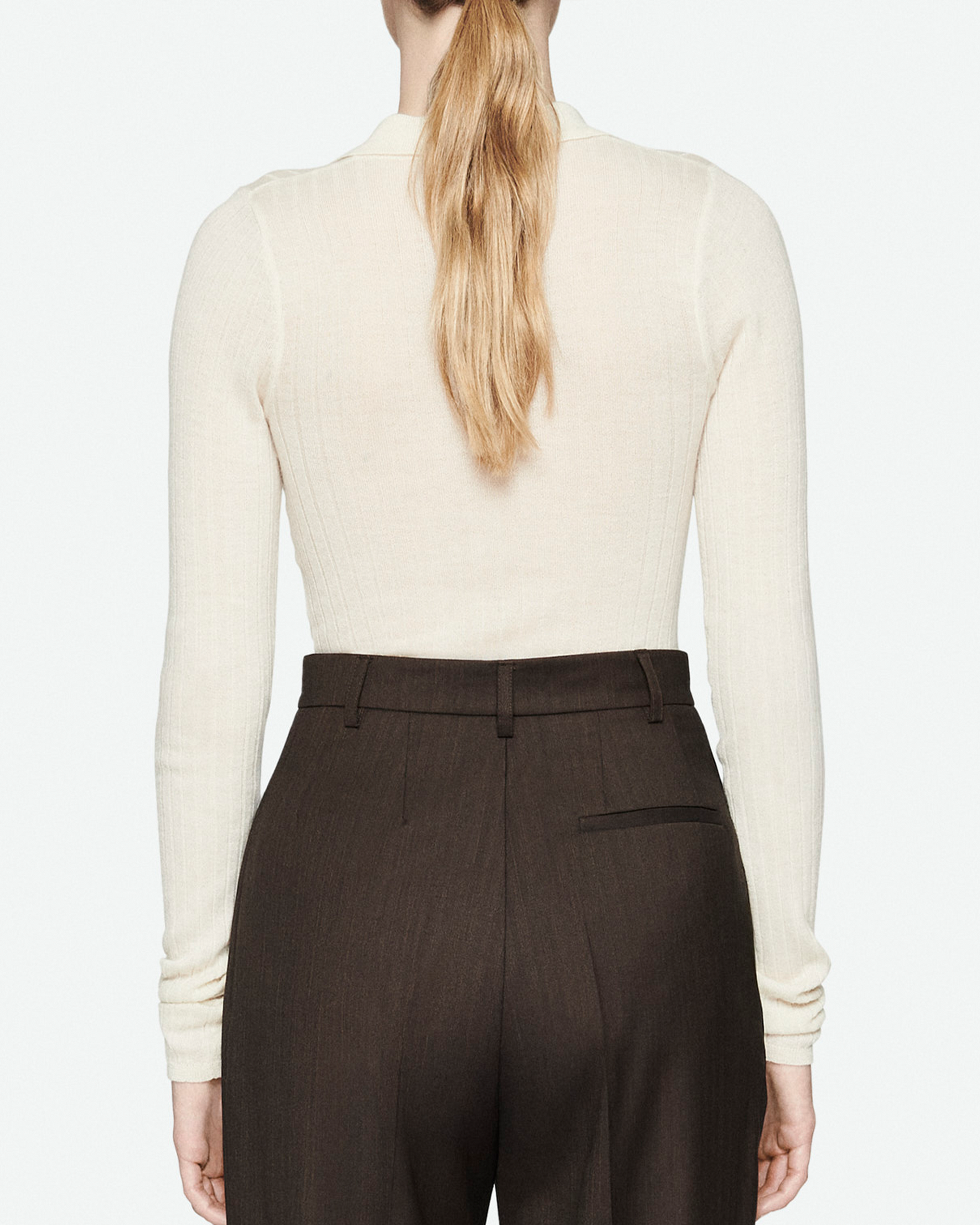 A refined blend of silk and cashmere, this cream polo features a thin ribbed texture. Elegant and soft, it offers a luxurious feel with a subtle, sophisticated silhouette. Perfect for layering or wearing alone.