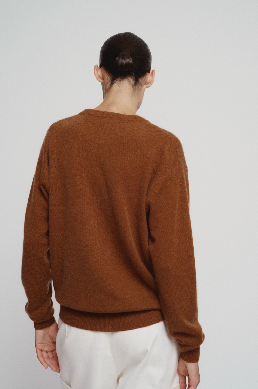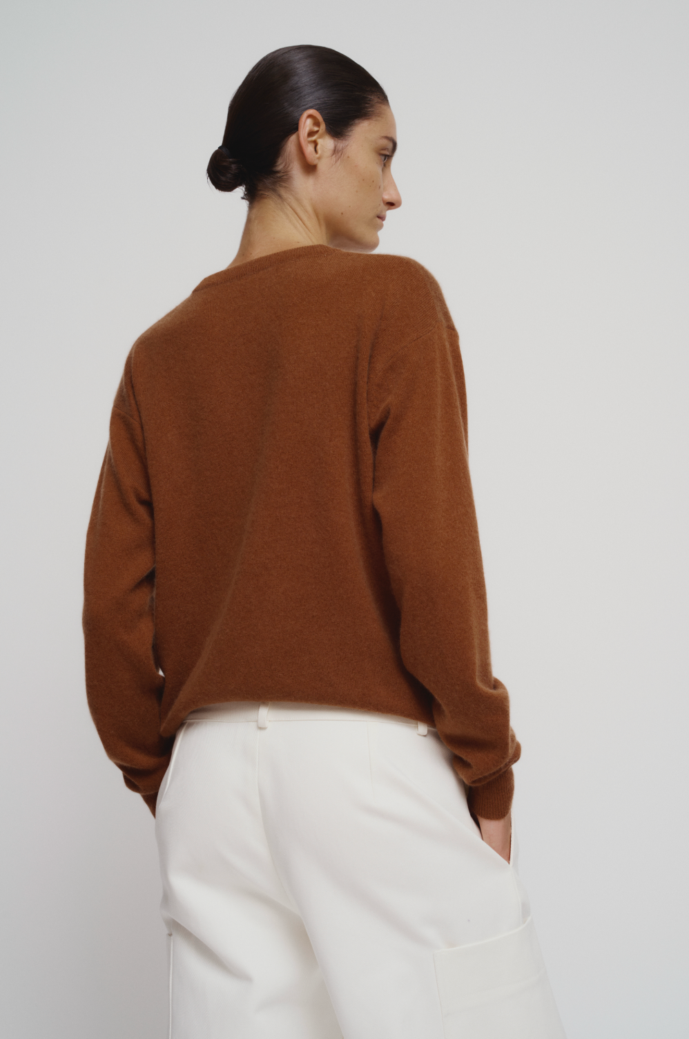 This oversized crew neck jumper is crafted from 100% premium caramel cashmere. The lightweight, fine knit offers a soft, breathable feel, perfect for year-round layering or stand-alone wear. Designed with a relaxed silhouette and subtly cinched arms and hem, delivering an effortlessly chic look that balances comfort and understated luxury.
