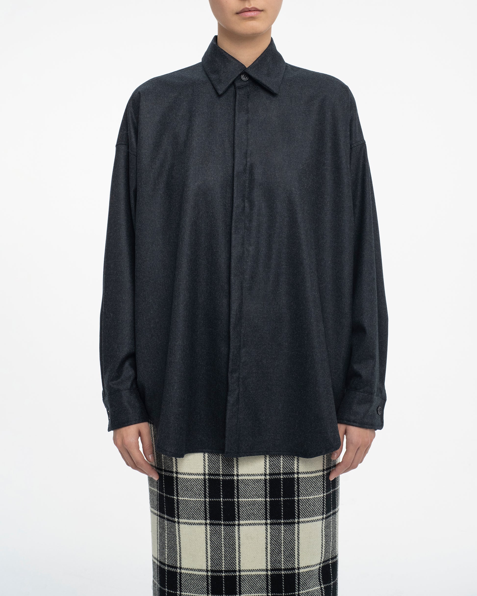Crafted from soft Italian wool flannel, this oversized shirt offers a relaxed, easy fit with a sophisticated drape. Designed with dropped shoulders and hidden buttons for a refined look, it combines effortless comfort with understated elegance. Runs large and follows American sizing.