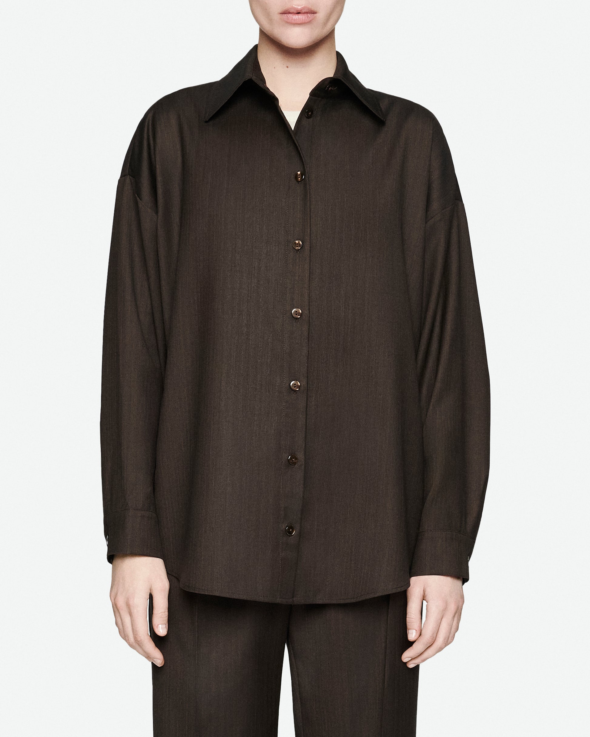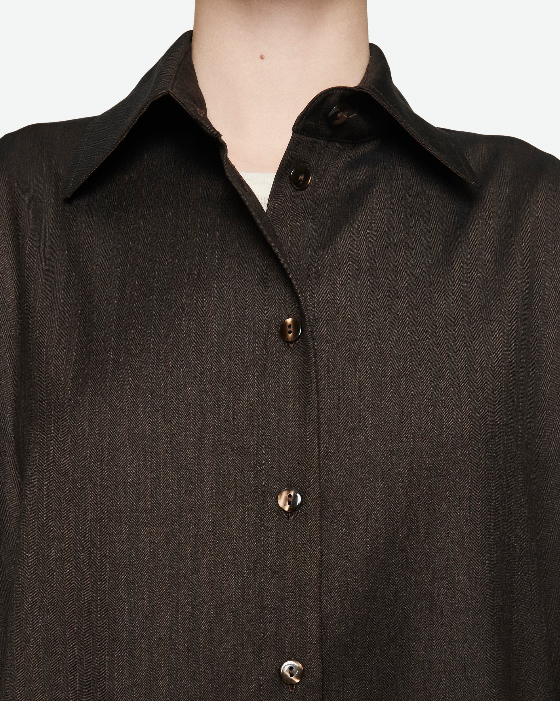 The Classic Nami oversized shirt, featuring an extra collar for distinctive style. Crafted in a luxurious herringbone virgin wool, it offers a light yet structured feel. Combining elegance and ease, this versatile shirt makes an effortless addition to any wardrobe.