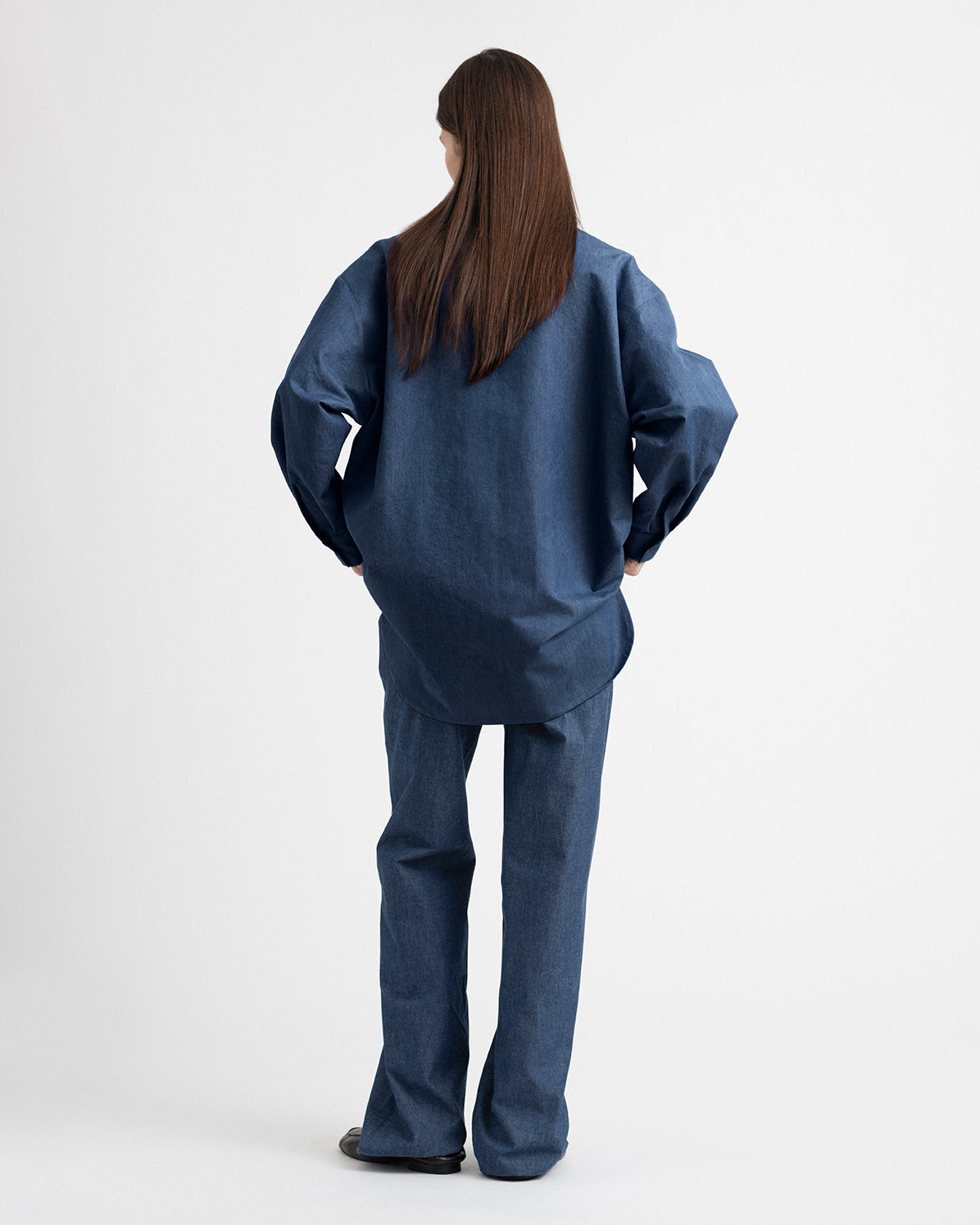 Chambray, versatile and thin five pockets pants crafted from 100% cotton. Designed with a mid-rise waist, clean back construction, and a straight, elongated leg with a relaxed fall. Minimal detailing emphasizes the purity of the silhouette and the natural texture of the denim.