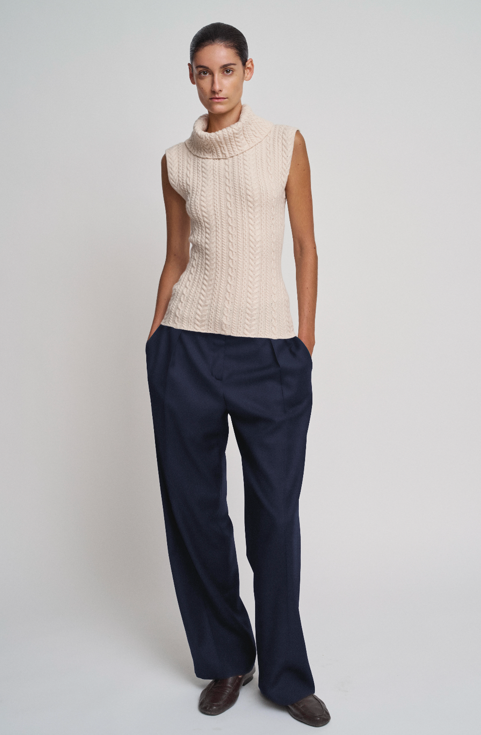 Navy blue tailored pants in fine silk and virgin wool Italian fabric. Loose, relaxed fit with two pleats and a straight leg with a subtle flare. Tiny latch pocket inspired by traditional tailoring. True to size and effortlessly versatile.