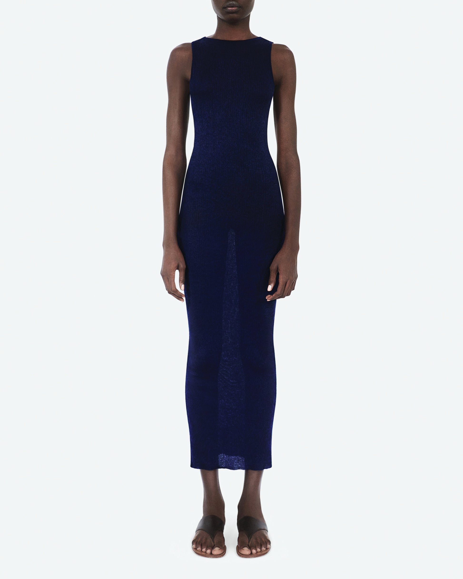 Light sleeveless body-icon dress with crew neckline and midi length in knitted in navy blue silk and cashmere.