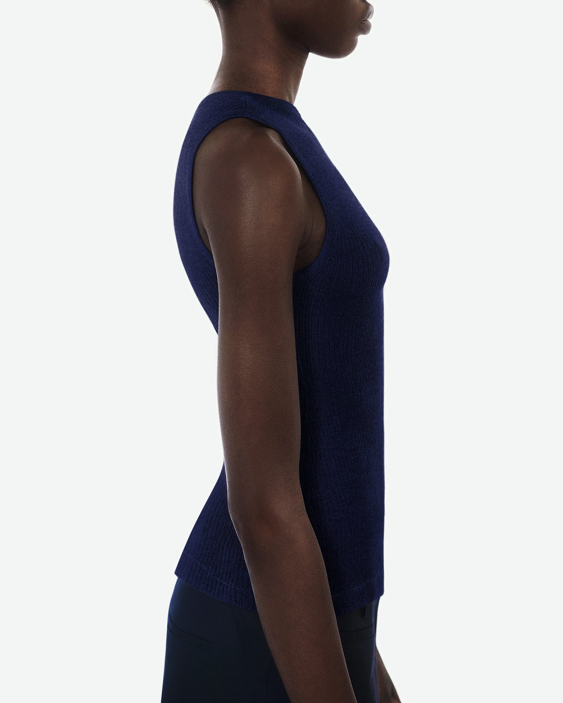 Light sleeveless body-icon tank top with crew neckline waist lenght knitted in navy blue silk and cashmere.