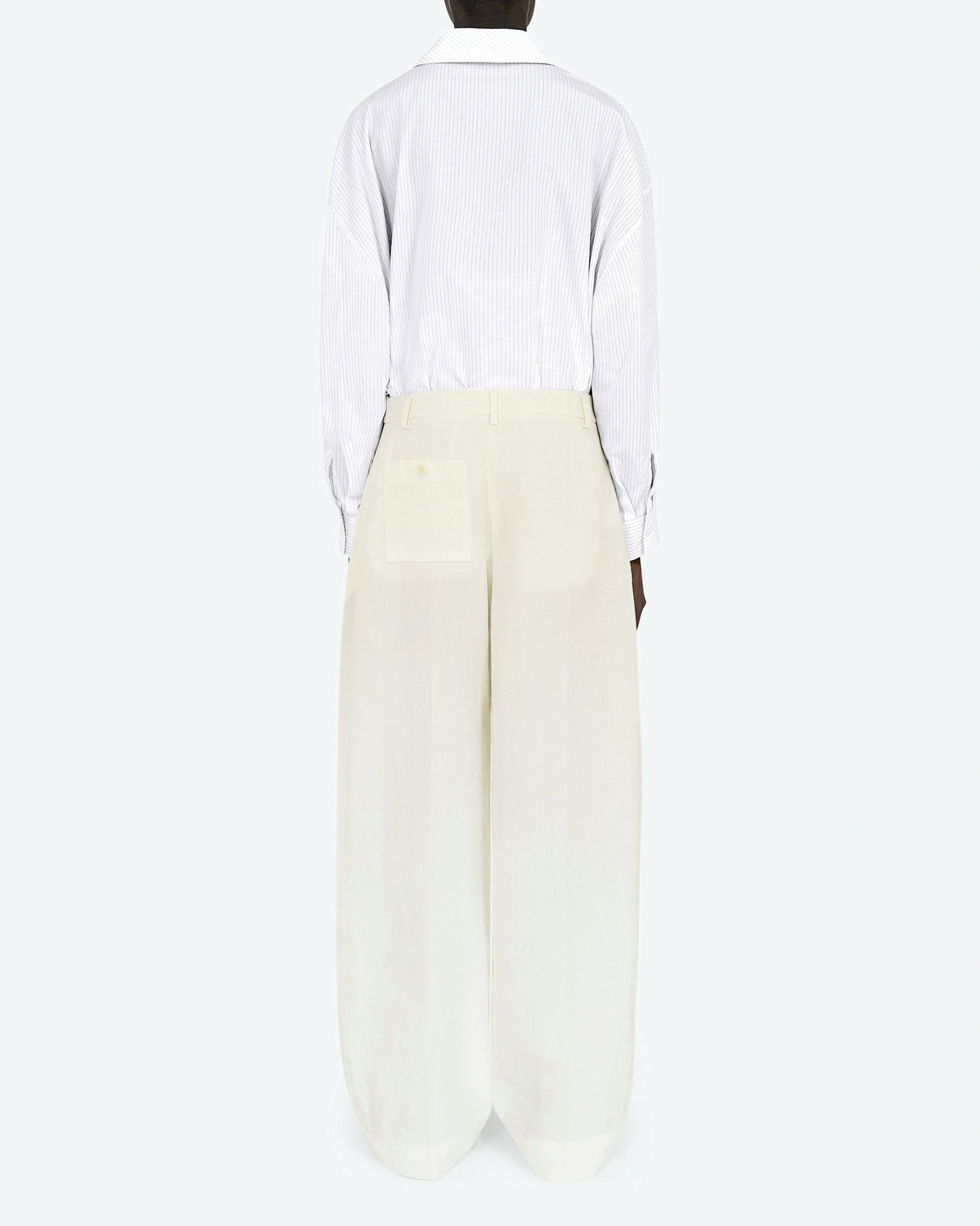 White wide pants made from silk and viscose canvas. Featuring two front pockets, one back pocket, and a front pleat for an elegant look.