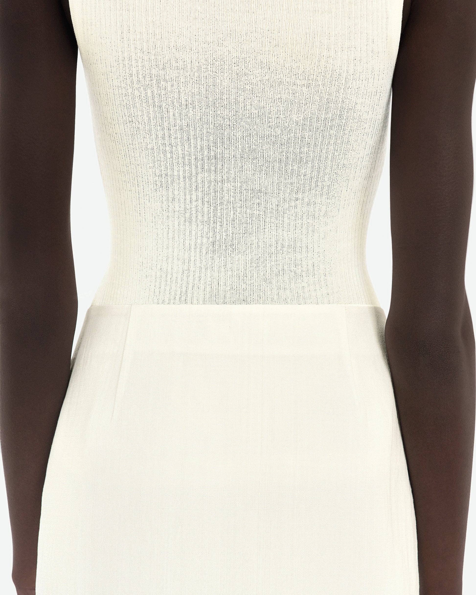 Silk and viscose white canvas calf-length wrapped skirt with a straight silhouette and two bound options that offer distinct shapes.