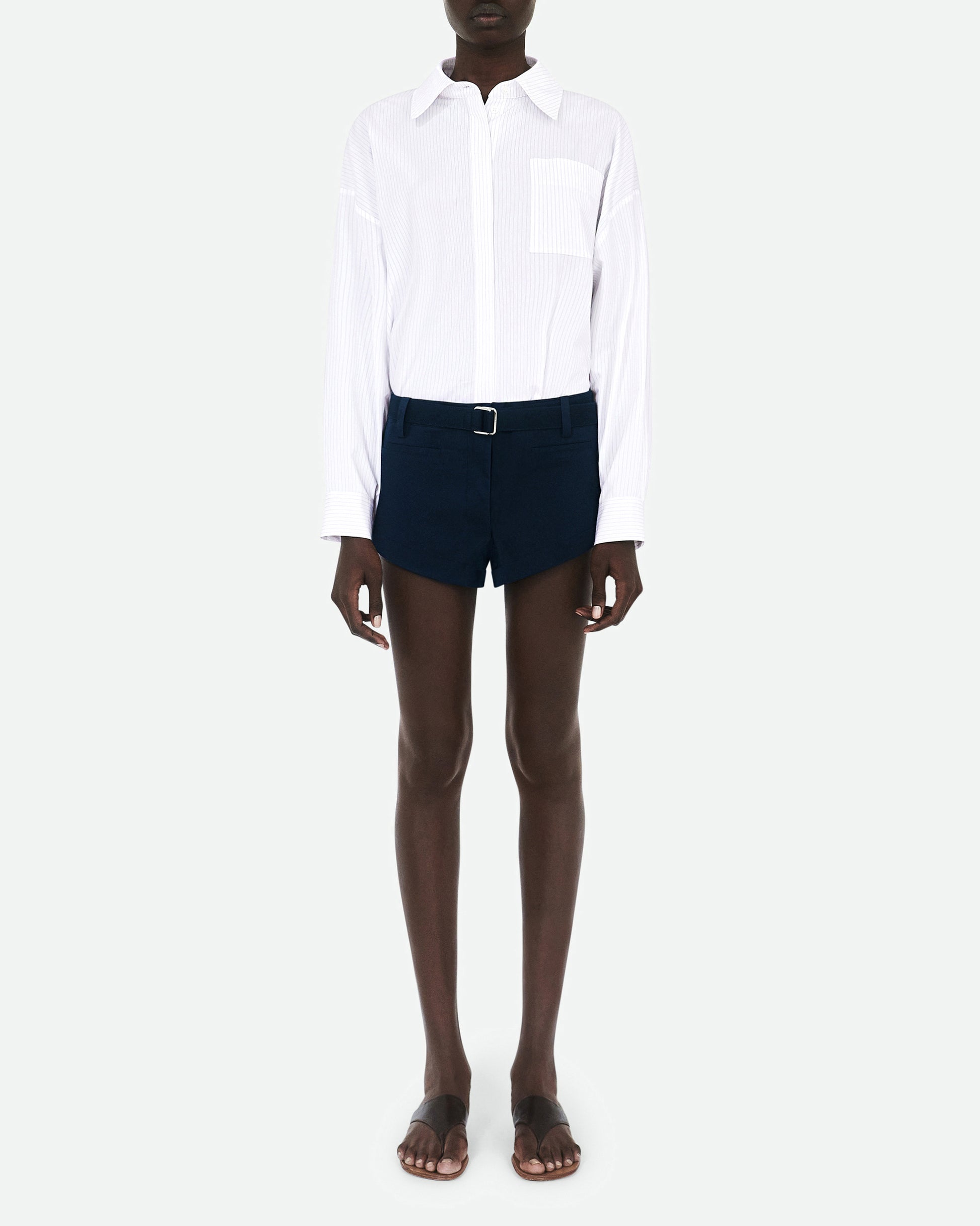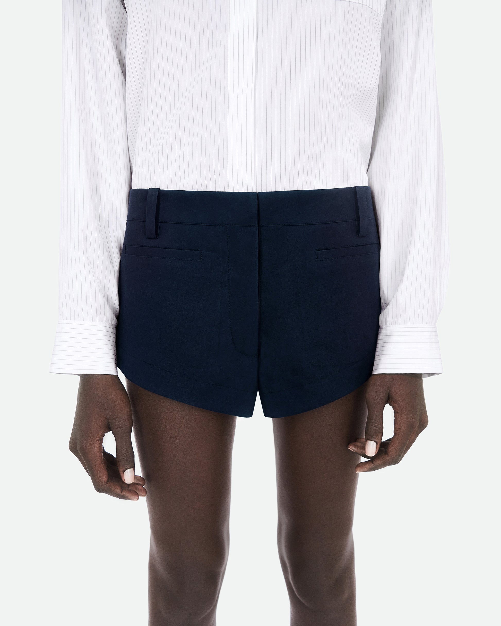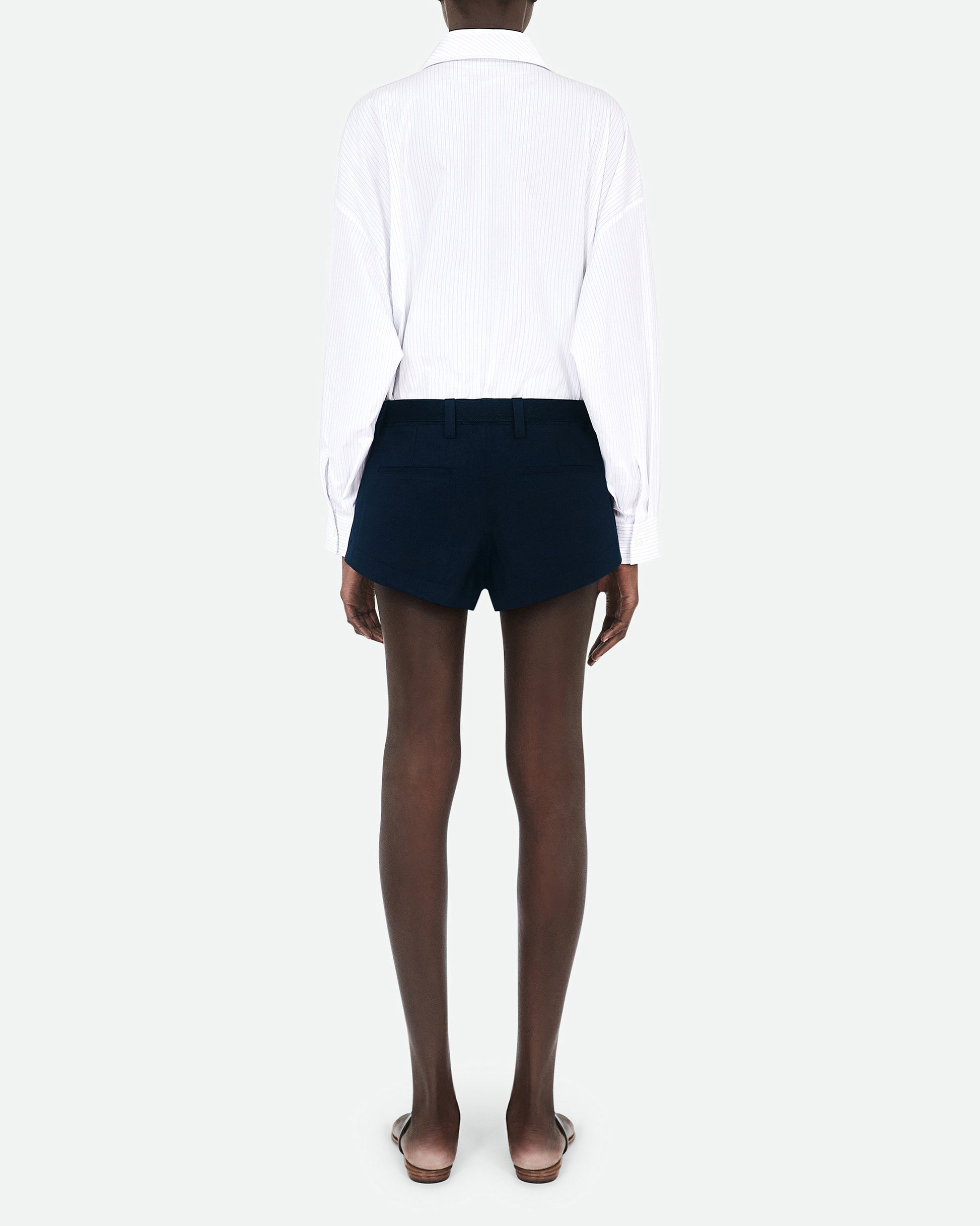 Low-waist micro short in waxed cotton with front hidden button. This short is hand bonded following traditional mackintosh technique.