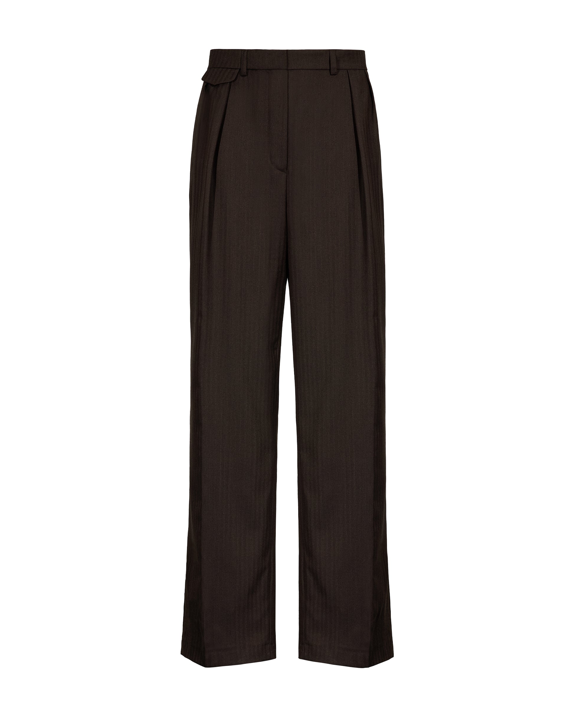 Dark brown tailored pants in fine silk and virgin wool Italian fabric. Loose, relaxed fit with two pleats and a straight leg with a subtle flare. Tiny latch pocket inspired by traditional tailoring. True to size and effortlessly versatile.